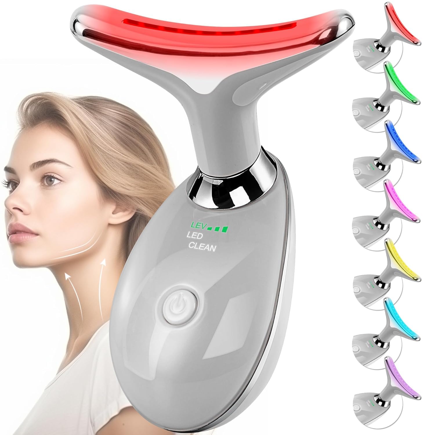 Dit LED-schoonheidsapparaat beschikt over 7 lichtstanden en een zachte warmte ter ondersteuning van huidverjonging. Het is ontworpen om comfortabel langs de hals en kaaklijn te passen en helpt de huid te ontspannen, de bloedsomloop te verbeteren en een gladdere, stevigere uitstraling te bevorderen. Het is oplaadbaar via USB en draagbaar, dus gemakkelijk te gebruiken, zowel thuis als op reis.